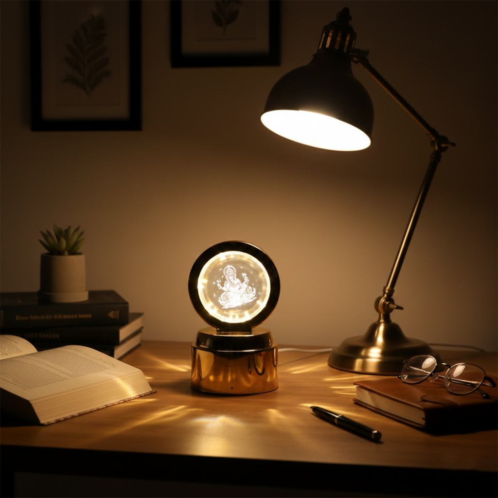 Bring blessings, positivity, and divine elegance into your space with this beautifully crafted Ganpati Bapa Crystal Ball Night Light. The crystal ball features a finely engraved 3D image of Lord Ganesha that illuminates gracefully when the LED light is turned on. The soft glow highlights the detailed engraving, creating a calm and spiritual environment suitable for daily worship and relaxation.