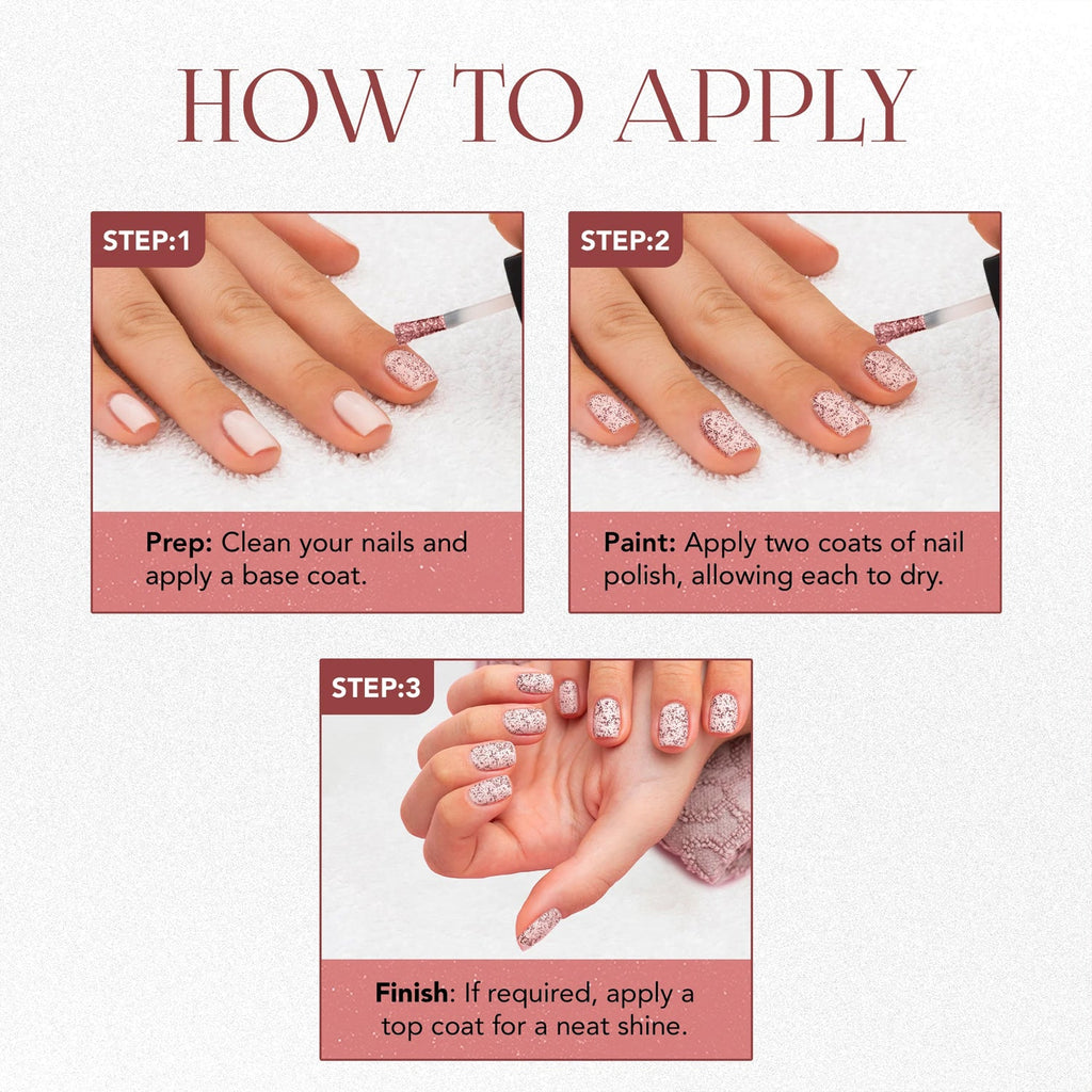 Formulated with a quick-dry and long-lasting finish, this nail paint ensures your nails look flawless for days. The glitter particles are evenly suspended for smooth application, providing full coverage with a radiant shine. Housed in a sleek 10 ML bottle, this nail polish is both stylish and easy to carry.