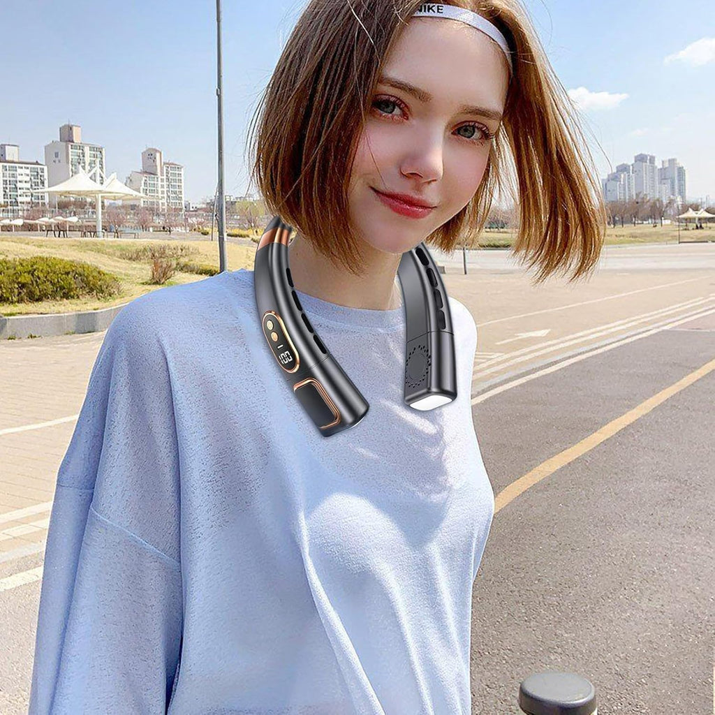 neck fan, wearable fan, USB rechargeable neck fan,personal cooling fan, hands free fan, digital display fan, LED light neck fan, portable cooling fan,portable USB fan, rechargeable wearable fan,summer cooling device, personal air cooler, stylish neck fan