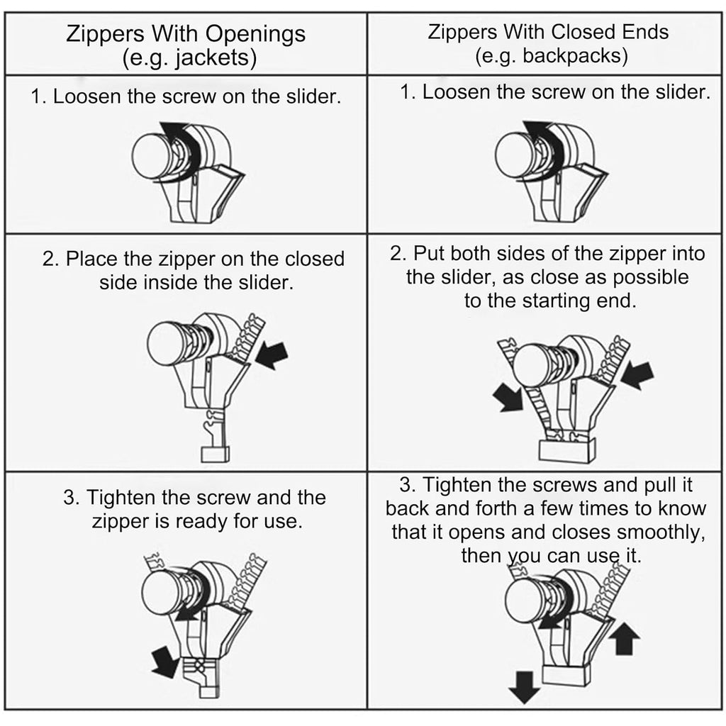 • How to use: Open zipper (such as jacket): 1. Loosen the screw on the slider, 2. Put the zipper on the closed side into the slider, 3. Tighten the screw and the zipper can be used as usual Closed zipper (such as backpack): 1. Loosen the screw on the slider, 2. Put the zippers on both sides into the slider, as close to the starting end as possible, 3. Tighten the screw, pull back and forth several times until the opening and closing are smooth and you can use it as usual